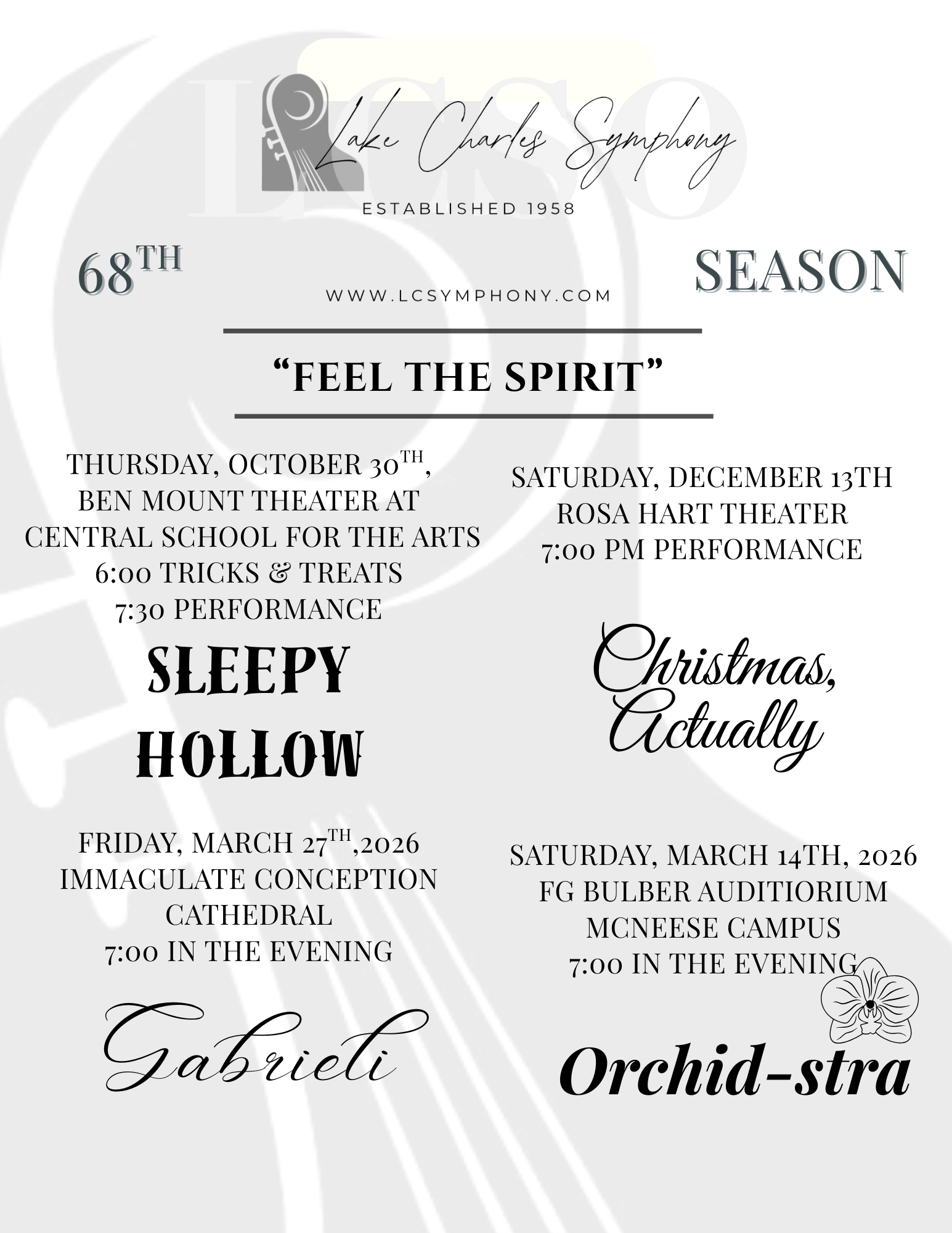The Lake Charles Symphony is a cornerstone of Southwest Louisiana’s heritage and culture. Your Symphony is social, thrilling and inspiring, and—above all—it permeates everything around us. Music is a truly communal experience that stops time while transporting you back in time to witness the great musical masters at work. From Brahms to Broadway, and from Movie Scores to Mozart, The Lake Charles Symphony Orchestra performances will inspire you. Help us keep symphonic music alive in Southwest Louisiana for everyone to enjoy. Music connects us all.